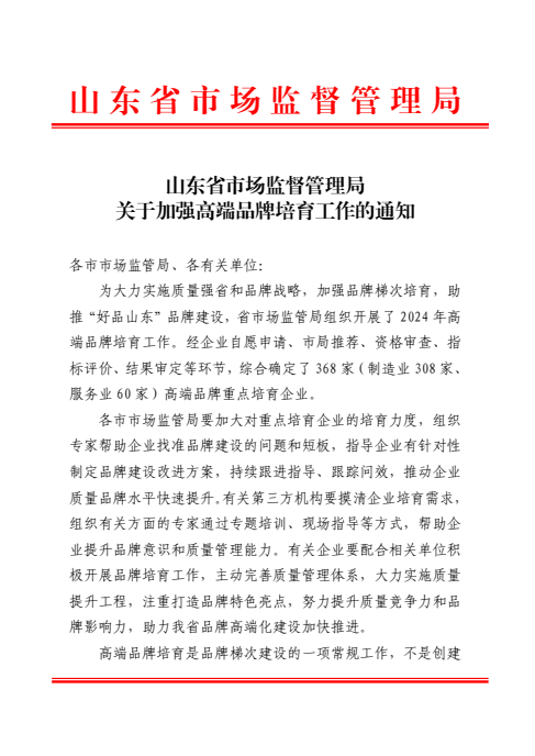 近日,山东省市场监管局公布了2024年度山东省高端品牌培育企业名单,我公司凭借出色的品牌实力与市场竞争力,成功脱颖而出,荣耀入选。